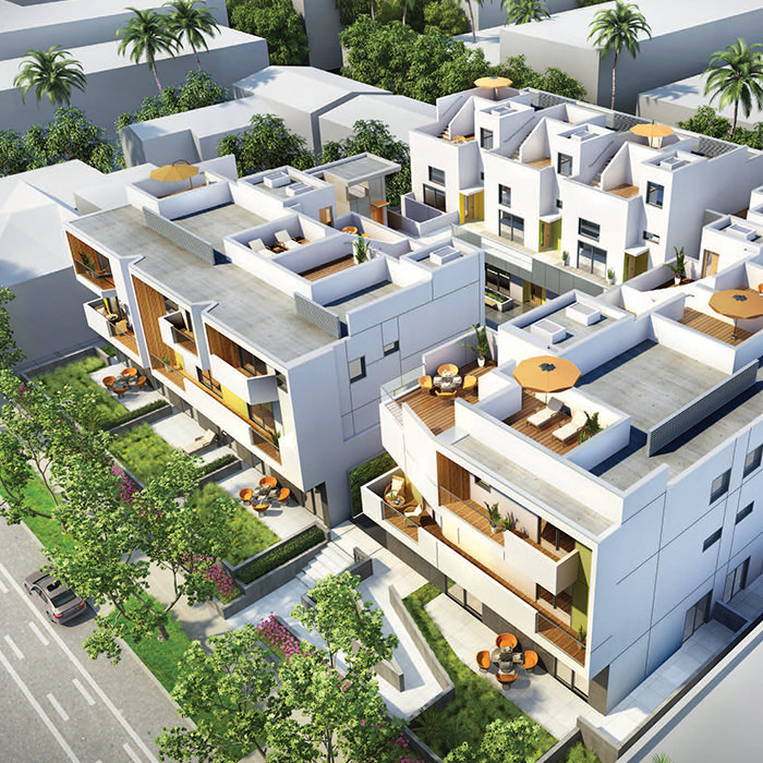 The latest project to emerge is AIRE Santa Monica, a boutique condominium currently under construction on 14th Street. Developed by L.A.-based real-estate firm Palisades, the ecofriendly project consists of three buildings set around a courtyard—one that is dotted with lounge spaces, water features and a living wall.